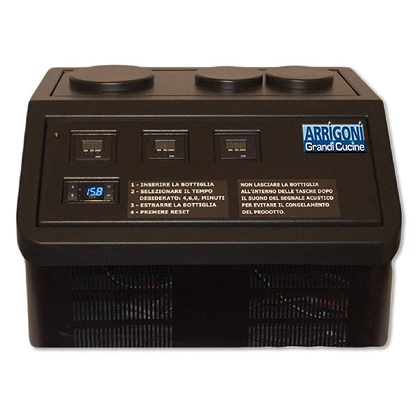 Abbattitore per bottiglie di vino di tutte le taglie, dalla standard alla magnum. Struttura esterna in lamiera plastificata atossica con coperchio in ABS. E’ dotato di temperatura regolabile con timer digitale. La refrigerazione avviene per contatto tra le bottiglie e sacche contenenti glicole a bassa temperatura. E’ presente un agitatore di liquido all’interno della vasca per uniformare la temperatura di abbattimento. Equipaggiato con pompa sommersa per l’estrazione del glicole in fase di pulizia. Abbattimento di 1,5°C al minuto. Sono presenti 2 fori per bottiglia standard e 1 foro per bottiglia magnum. In dotazione 3 tasche montate più 9 di ricambio e 3 taniche da 5 litri di glicole.