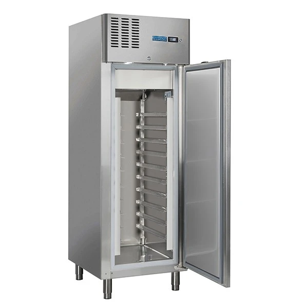 FULL OPTIONAL: Armadio refrigerato EURONORM costruito in acciaio inox con refrigerazione ventilata. Sbrinamento automatico con resistenza elettrica. La schiumatura realizzata in Ciclopentano presenta uno spessore di 7,5 cm. L’armadio è dotato di un termostato digitale per il controllo della temperatura. All’interno della camera è presente illuminazione a LED e nell’anta le guarnizioni sono estraibili per facilitarne la pulizia. La porta autochiudente è reversibile e dotata di serratura di serie. In dotazione 10 coppie di guide per alloggiare i vassoi 60×40. Quattro piedi in acciaio regolabili.
