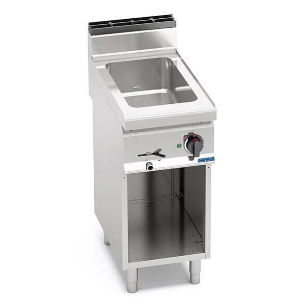 Bagnomaria elettrico perfetto per mantenere in caldo tutti i tipi di cibi. Per facilitare le operazioni di pulizia la vasca in acciaio inox AISI 304 è stata creata con spigoli raggiati. All’interno della stessa è possibile inserire 6 diverse combinazioni di bacinelle gastronorm. Interno, piano di lavoro, pannelli frontali e laterali in acciaio inox AISI 304. Rubinetto di scarico frontale a sfera, dotato di sistema di sicurezza contro eventuali aperture accidentali e maniglia atermica posto all’interno del vano con bacinella di raccolta in acciaio. Resistenze in acciaio inox incoloy poste all’esterno della vasca. Regolazione elettronica della potenza. Spie di tensione e piedini regolabili.