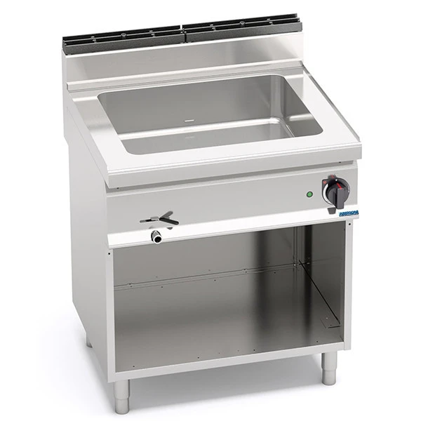 Bagnomaria elettrico perfetto per mantenere in caldo tutti i tipi di cibi. Per facilitare le operazioni di pulizia la vasca in acciaio inox AISI 304 è stata creata con spigoli raggiati. All’interno della stessa è possibile inserire 6 diverse combinazioni di bacinelle gastronorm. Interno, piano di lavoro, pannelli frontali e laterali in acciaio inox AISI 304. Rubinetto di scarico frontale a sfera, dotato di sistema di sicurezza contro eventuali aperture accidentali e maniglia atermica posto all’interno del vano con bacinella di raccolta in acciaio. Resistenze in acciaio inox incoloy poste all’esterno della vasca. Regolazione elettronica della potenza. Spie di tensione e piedini regolabili.