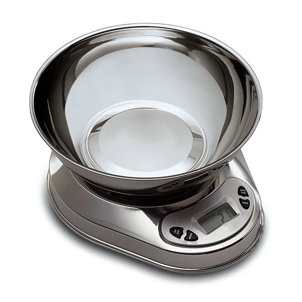 Bilancia digitale portatile da cucina dotata di display. Struttura in acciaio inox con contenitore superiore. Alimentazione a batterie. Completa di funzione di azzeramento, tara e tre unità di misura (Kg, once e libbre).