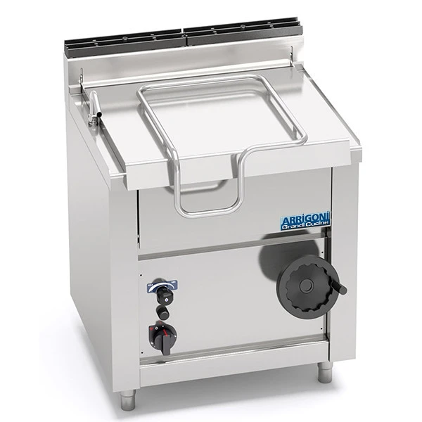Macchinario che permette di: brasare, soffriggere, grigliare o cuocere direttamente sul fondo della vasca, utilizzato soprattutto per le lunghe cotture in umido, riesce a sigillare all’interno i vapori e gli aromi prodotti. E’ una tecnica di cottura mista, per cui l’alimento è sottoposto, in tempi successivi, a due tipi di cottura: l’arrostitura prima e, subito dopo, una cottura umida con l’aggiunta di brodo, fondi, vino o altro che lo ricoprono per metà. La cottura deve avvenire con il coperchio per evitare la fuoriuscita di vapore. Si brasano soprattutto le carni che necessitano lunghe cotture, quindi prevalentemente carni rosse e selvaggina da pelo (cinghiale, daino, cervo, capriolo). Costruzione interna ed esterna completamente in acciaio inox (parti esterne con finitura Scotch Brite). Coperchio fissato su cerniera auto-bilanciata in acciaio inox AISI 304 con maniglia di grande spessore in acciaio inox AISI 304. Vasca di cottura con pareti in acciaio inox AISI 304 spessore 20/10 con finitura antiaderente a microsfere in ceramica ed angoli completamente arrotondati. Sul piano è posto un rubinetto erogatore con collo di grande portata. Volantino per il sollevamento vasca con maniglia rientrante. Riscaldamento uniforme del fondo con bruciatori in acciaio inox a più rami di fiamma, con valvola di sicurezza a termocoppia e fiamma pilota protetta. Comando con valvola termostatica di grande precisione con regolazione della temperatura da 100°C a 300°C.