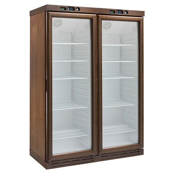 Cantinetta vino con mobile in legno. Porte con telaio in LEGNO MASSICCIO e vetro-camera. Colore Noce Scuro (come da foto), Noce Chiaro e Wengè. Refrigerazione di tipo statico con evaporatore in piastra di alluminio posizionato sulla parete di fondo. Termoregolatore per il controllo automatico della temperatura. Evaporazione acqua di condensa automatica. Illuminazione a plafoniera comandata da interruttore. Ventilatore interno collegato direttamente all’alimentazione per rendere uniforme, in tutti i vani, la temperatura. In dotazione 4 griglie di cm 50,5X41,5, 1 grigia di cm 50,5X21,5 e 6 ripiani fissi.
