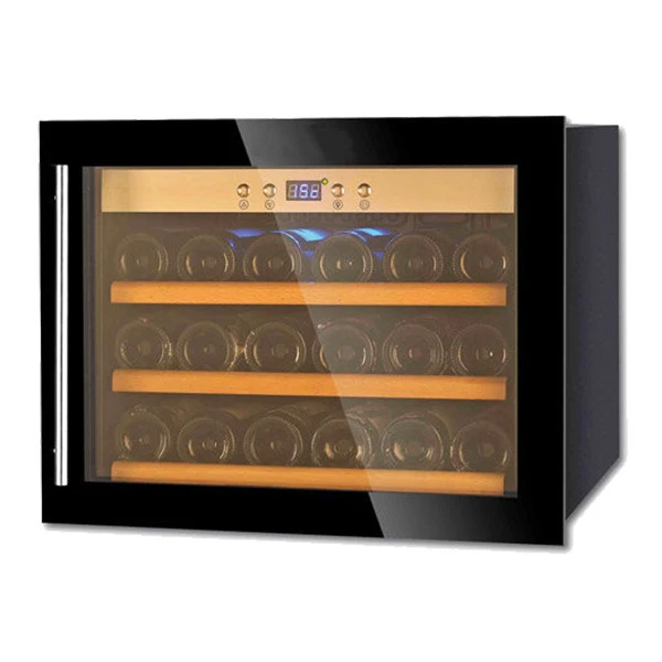 Cantinetta vino da incasso dotata di maniglia in acciaio satinato e vetri fumè con filtro anti-UV. Refrigerazione statica No-Frost con evaporazione automatica dell’acqua di condensa. All’interno sono presenti griglie telescopiche in legno e illuminazione LED blu di serie.