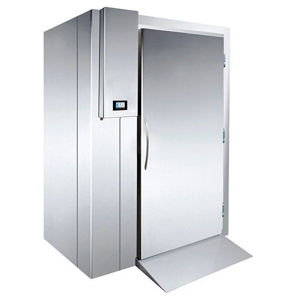 PRODOTTO TOTALMENTE ITALIANO – Cella di abbattimento professionale di grande capienza, ideale per l’inserimento di carrelli porta teglie GN1/1 – GN2/1 – 60×40 – 60×80. Costruita totalmente in acciaio inox AISI 304 con struttura a pannelli con isolamento in poliuretano ecologico di 10 cm. Internamente presenta spigoli arrotondati e paracolpi in acciaio inox. Viene fornita di serie con rampa di accesso in acciaio inox in corrispondenza della porta. La porta autochiudente di accesso ha una luce di 90 h 200 cm ed è dotata di guarnizioni magnetiche facilmente sostituibili. Il prodotto viene fornito di unità condensatrice remota carenata e silenziata in pressione positiva di azoto posizionabile ad un massimo di 15 m. E’ dotata di sbrinamento automatico a gas caldo e attivazione automatica della fase di conservazione positiva o negativa a fine ciclo. Sul fronte si trova un pannello comandi elettronico con display grafico touch-screen a colori che consente la gestione dei cicli HARD e SOFT sia in abbattimento che in surgelazione e la possibilità di memorizzare cicli di abbattimento e conservazione. E’ completa di buzzer di segnalazione e allarme, porta seriale per il collegamento a sistemi di supervisione e porta USB per il download dei dati registrati. VIENE FORNITA SMONTATA e necessita dei collegamenti frigoriferi per l’unità condensatrice remota
