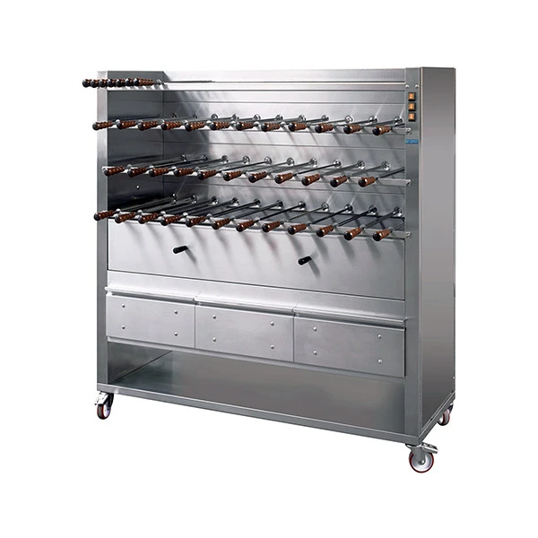 PRODOTTO TOTALMENTE ITALIANO – Churrasco 35 spade professionale con struttura in acciaio inox grecata e rinforzata. E’ dotato di illuminazione interna e cassettoni estraibili in acciaio inox per lo scarico della cenere. E’ composta da 3 ripiani dove ogni spada è dotata di motoriduttore indipendente, la struttura ha la parte superiore aperta per favorire l’uscita dei fumi e nella parte frontale è dotato di coperchio apribile per il carico della carbonella. L’induzione del calore proviene da terra con la cottura a carbonella e permette la colatura del grasso verso il basso. La cottura avviene in modo tipico e uniforme e si può servire con gli appositi spadoni. In dotazione 20 spade medie, 10 spade piccole, 3 spade grandi, 2 forchettoni, 4 ruote di cui 2 con il freno.