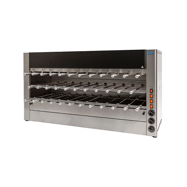 PRODOTTO TOTALMENTE ITALIANO – Churrasco 35 spade professionale con struttura in acciaio inox grecata e rinforzata. E’ dotato di illuminazione interna, 2 bacinelle estraibili in acciaio inox per la raccolta grassi. E’ composta da 3 ripiani dove ogni spada è dotata di motoriduttore indipendente. L’induzione del calore proviene dal cielo e permette la colatura del grasso verso il basso. La cottura avviene in modo tipico e uniforme e si può servire con gli appositi spadoni. In fase di ordine è possibile scegliere la cottura a gas o elettrico. Con la cottura a gas è dotato di 2 bruciatori multigas indipendenti, con accensione piezoelettrica e con valvola di sicurezza. Con la cottura elettrica è dotato di resistenze corazzate con regolatori di energia a basso consumo energetico. In dotazione 20 spade medie, 10 spade piccole, 3 spade grandi e 2 forchettoni.