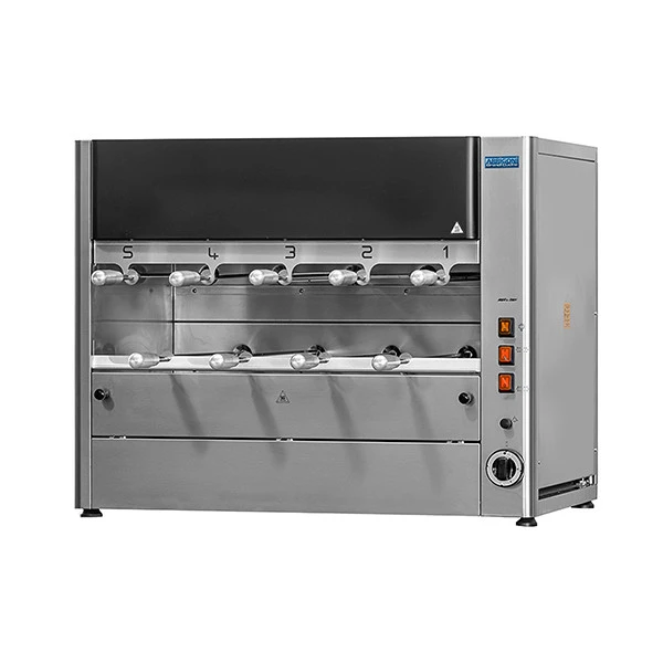 PRODOTTO TOTALMENTE ITALIANO – Churrasco 9 spade professionale con struttura in acciaio inox grecata e rinforzata. E’ dotato di illuminazione interna, bacinella estraibile in acciaio inox per la raccolta grassi. E’ composta da 2 ripiani dove ogni spada è dotata di motoriduttore indipendente. L’induzione del calore proviene dal cielo e permette la colatura del grasso verso il basso. La cottura avviene in modo tipico e uniforme e si può servire con gli appositi spadoni. In fase di ordine è possibile scegliere la cottura a gas o elettrico. Con la cottura a gas è dotato di 1 bruciatore multigas e con valvola di sicurezza. Con la cottura elettrica è dotato di resistenze corazzate con regolatori di energia a basso consumo energetico. In dotazione 6 spade medie, 2 spade piccole e 1 spada grande.