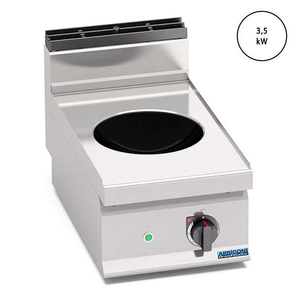 Cucina professionale con piano di lavoro in acciaio inox AISI 304. Dotata di piano in vetroceramica di 6 mm di spessore. La zona di riscaldamento si attiva solamente quando la pentola viene a contatto con il piano e si autoregola in base al suo diametro. Sul piano è presente apposita serigrafia per consentire un corretto posizionamento delle pentole. Il riscaldamento si arresta immediatamente quando la pentola viene rimossa dal piano. Regolazione di potenza tramite un robusto comando di precisione. Equipaggiata con n. 1 campo concavo per wok diametro 300 mm (potenza 3,5 kW). Piedini regolabili. Alimentazione standard monofase.