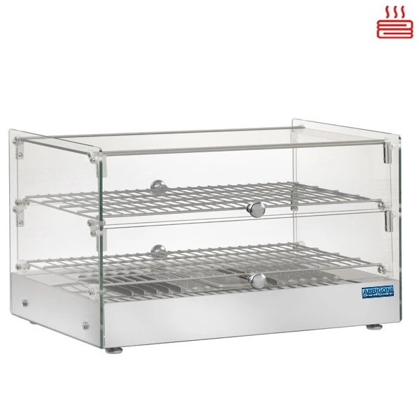 Adatto per l’esposizione di prodotti alimentari a temperature comprese tra +30 e +90°C. Struttura interna ed esterna in acciaio inox e vetro, termostato meccanico per la regolazione della temperatura ed interruttore generale di accensione. Sportelli apribili su entrambi i lati, griglie in acciaio cromato rimuovibili per la pulizia. Cassetto raccogli briciole in acciaio inox e vaschetta interna per l’acqua per mantenere il giusto livello di umidità all’interno della vetrina