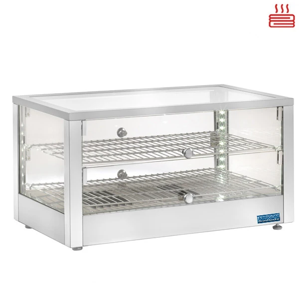 Adatto per l’esposizione di prodotti alimentari a temperature comprese tra +30 e +90°C. Struttura interna ed esterna in acciaio inox e vetro, termostato meccanico per la regolazione della temperatura ed interruttore generale di accensione. Sportelli apribili su entrambi i lati, griglie in acciaio cromato rimuovibili per la pulizia. Cassetto raccogli briciole in acciaio inox e vaschetta interna per l’acqua per mantenere il giusto livello di umidità all’interno della vetrina, luce interna a strisce LED. In dotazione 4 piedini.