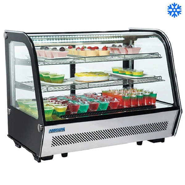 Espositore refrigerato da banco con refrigerazione ventilata. Vetro curvo con cornice e basamento in acciaio inox. Sbrinamento automatico a fermata compressore. E’ dotato di doppio vetro anti condensazione e luce interna LED. Lato operatore si trovano due sportelli scorrevoli e il controllo con display digitale. In dotazione due ripiani regolabili cromati e quattro supporti fissi assemblati sotto il basamento.