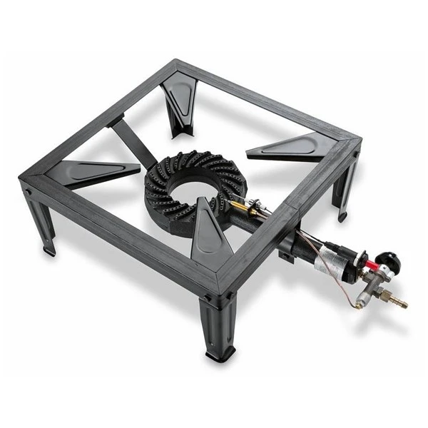Fornellone in ghisa con 4 piedi con supporto pentola. E’ provvisto di valvola con termocoppia e accensione piezo. Funzionamento a gas GPL.