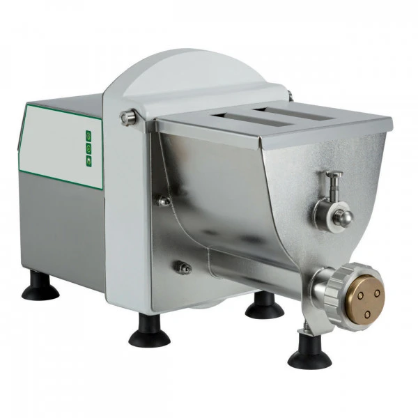 Macchina professionale per pasta fresca per impastare ed estrudere impasti all’uovo in diversi formati. La struttura è dotata di vasca, supporto vasca sono in acciaio inox, mentre gancio impastatore e elica costruiti in acciaio inox AISI 304. E’ fornita di coperchio con feritoie che permette l’inserimento di prodotti anche durante la lavorazione. Per garantire massima sicurezza durante il suo utilizzo, presenta un microinterruttore sul coperchio della vasca. La vasca è facilmente estraibile per consentire le operazioni di pulizia. Pannello comandi digitale di serie. Questa versione non comprende il coltello taglia pasta automatico che può essere acquistato come optional. Si possono acquistare separatamente diversi formati di trafile in lega ottone/bronzo per estrudere varie tipologie di pasta, il coltello taglia pasta, il carrello e il cavalletto.