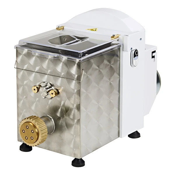Macchina professionale per pasta fresca per impastare ed estrudere impasti all’uovo in diversi formati. La struttura è rivestita con vernice anti-graffio. E’ dotata di vasca e gancio impastatore in acciaio inox, mentre l’elica è costruita in lega di ottone/bronzo. Per garantire massima sicurezza durante il suo utilizzo, presenta un microinterruttore sul coperchio della vasca. Questa versione non comprende il coltello taglia pasta automatico. Si possono acquistare separatamente diversi formati di trafile in lega ottone/bronzo per estrudere varie tipologie di pasta.