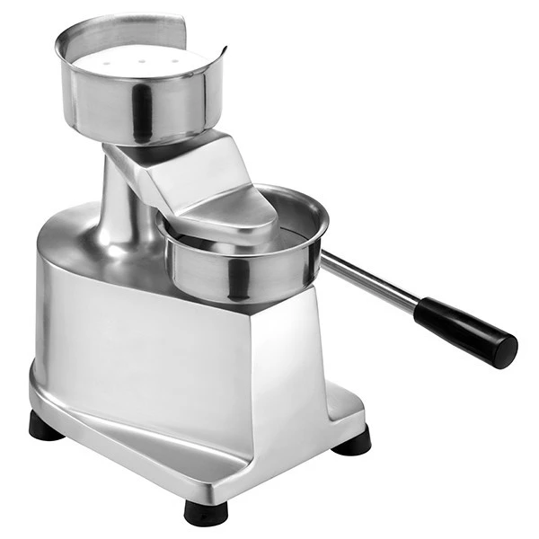 Pressa hamburger manuale con struttura in alluminio anodizzato. Le parti a contatto con la carne sono in acciaio inox nel rispetto delle normative vigenti. Lo stampo forma hamburger del diametro di 10 cm. Acquistabile separatamente confezione di cellophan da 1 Kg.