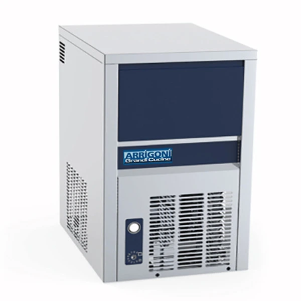 PRODOTTO TOTALMENTE ITALIANO – Produttore di ghiaccio a cubetti pieni di gr. 18. Interno ed esterno realizzato in acciaio inox. Disponibile con raffreddamento ad aria o ad acqua con ambiente tropicalizzato +43°. E’ dotato di filtro pulibile e trattato anti calcare. Interruttore generale posto separatamente sulla parte anteriore. Superfici interne arrotondate per facilitarne la pulizia. Soddisfa una produzione giornaliera di Kg. 25 di ghiaccio.