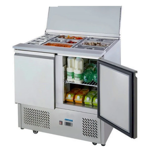 Saladette refrigerata con struttura realizzata in acciaio inox. Piano TOP in acciaio inox apribile con piano fisso lato operatore in polietilene. Motore tropicalizzato, lavora fino a temperature di 30°C ambiente e 55% di umidità. E’ dotata di refrigerazione statica con ventilazione di assistenza e sbrinamento ad aria. Il termostato digitale permette un facile controllo della temperatura. Le porte autochiudenti con bloccaggio verso l’esterno hanno guarnizioni a incastro facili da smontare. L’interno ha angoli arrotondati per facilitarne la pulizia. Lo spessore di isolamento è di 3,5 cm. In dotazione di serie 1 griglia da cm. 33,5×59 per ogni anta.. Può alloggiare bacinelle gastronorm acquistabili separatamente.