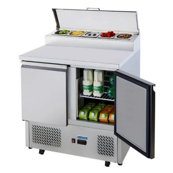Saladette refrigerata di ultima generazione a basso consumo energetico con struttura realizzata in acciaio inox. Motore tropicalizzato, lavora fino a temperature di 30°C ambiente e 55% di umidità. E’ dotata di refrigerazione statica con ventilazione di assistenza e sbrinamento ad aria. Il termostato digitale permette un facile controllo della temperatura. Le porte autochiudenti con bloccaggio verso l’esterno hanno guarnizioni a incastro facili da smontare. L’interno ha angoli arrotondati per facilitarne la pulizia. Lo spessore di isolamento è di 3,5 cm. Piano TOP in acciaio inox. In dotazione di serie 1 griglia da cm. 33,5×59 per ogni anta. Porta bacinelle posteriore con coperchio inox adatto ad alloggiare 5 bacinelle GN1/6 acquistabili separatamente.