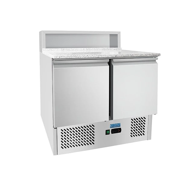 Saladette refrigerata con struttura realizzata in acciaio inox. Piano TOP in granito e con portacondimenti in acciaio inox. Motore tropicalizzato, lavora fino a temperature di 30°C ambiente e 55% di umidità. E’ dotata di refrigerazione statica con ventilazione di assistenza e sbrinamento ad aria. Il termostato digitale permette un facile controllo della temperatura. Le porte autochiudenti con bloccaggio verso l’esterno hanno guarnizioni a incastro facili da smontare. L’interno ha angoli arrotondati per facilitarne la pulizia. Lo spessore di isolamento è di 3,5 cm. In dotazione di serie 1 griglia cm 33,5×59 per ogni anta. Può alloggiare bacinelle gastronorm acquistabili separatamente.