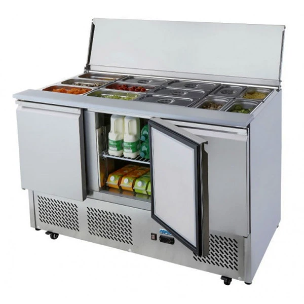 Saladette refrigerata con struttura realizzata in acciaio inox. Piano TOP in acciaio inox apribile con piano fisso lato operatore in polietilene. Motore tropicalizzato, lavora fino a temperature di 30°C ambiente e 55% di umidità. E’ dotata di refrigerazione statica con ventilazione di assistenza e sbrinamento ad aria. Il termostato digitale permette un facile controllo della temperatura. Le porte autochiudenti con bloccaggio verso l’esterno hanno guarnizioni a incastro facili da smontare. L’interno ha angoli arrotondati per facilitarne la pulizia. Lo spessore di isolamento è di 3,5 cm. In dotazione di serie 1 griglia da cm. 33,5×59 per ogni anta.. Può alloggiare bacinelle gastronorm acquistabili separatamente.