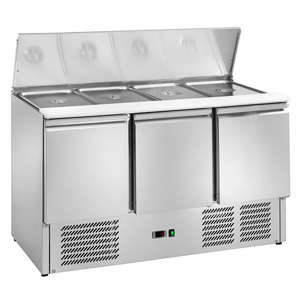 Saladette refrigerata con struttura realizzata in acciaio inox. Piano TOP in acciaio inox apribile con piano fisso lato operatore il polietilene. Motore tropicalizzato, lavora fino a temperature di 33°C ambiente e 60% di umidità. E’ dotata di refrigerazione statica con sbrinamento automatico. Il termostato digitale permette un facile controllo della temperatura. Lo spessore di isolamento è di 3,5 cm. Può alloggiare 4 bacinelle GN1/1 acquistabili separatamente.