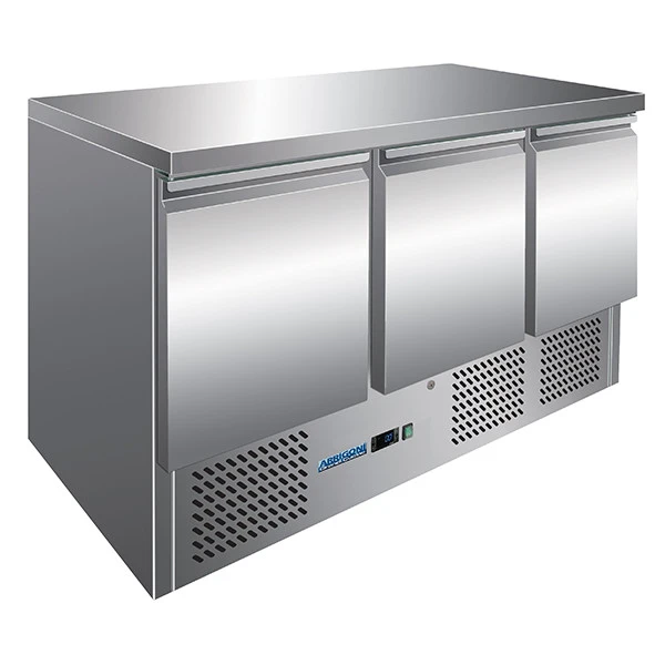 Saladette refrigerata con struttura realizzata in acciaio inox AISI 304. E’ dotata di refrigerazione statica con sbrinamento automatico, evaporatore statico con la schiumatura su tre lati, la ventola ha la capacità di uniformare la temperatura al suo interno. Il termostato digitale permette un facile controllo della temperatura. L’interno ha angoli arrotondati per facilitarne la pulizia. Lo spessore di isolamento è di 4 cm. Piano TOP in acciaio inox. In dotazione di serie 3 griglie GN 1/1 e 3 coppie di guide.