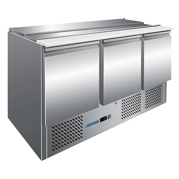 Saladette refrigerata con struttura realizzata in acciaio inox AISI 304, con tagliere il polietilene. E’ dotata di refrigerazione statica con sbrinamento automatico, evaporatore statico con la schiumatura su tre lati, la ventola ha la capacità di uniformare la temperatura al suo interno. Il termostato digitale permette un facile controllo della temperatura. E’ dotato di coperchio per l’apertura telescopica del piano. L’interno ha angoli arrotondati per facilitarne la pulizia. Lo spessore di isolamento è di 4 cm. Piano TOP in acciaio inox. In dotazione di serie 3 griglie GN 1/1 e 3 coppie di guide. Bacinelle escluse.