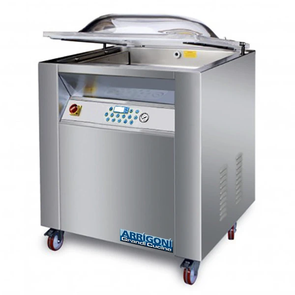 Macchina per sottovuoto a campana indicata per la conservazione degli alimenti mantenendone intatte le caratteristiche organolettiche e impedendo la proliferazione batterica. Struttura e vasca interna in acciaio inox AISI 304 e coperchio in plexiglass con apertura automatica a fine ciclo. E’ dotata di pannello comandi frontale LCD con 20 programmi memorizzabili. Sistema di saldatura a pistoni con barra saldante estraibile senza cavi. Completa di pompa BUSCH top di gamma. In dotazione di serie predisposizione per immissione gas inerte, funzione di pulizia olio in pompa, soft air, funzioni step vac ed extra vacuum. Optional: ULTERIORE BARRA SALDANTE LATERALE per l’esecuzione in contemporanea di due sottovuoto .