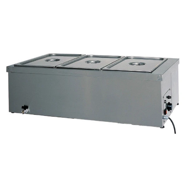 Robusta struttura in acciaio inox AISI 304 con termostato di temperatura regolabile da 30 a 90 °C. La parete della vasca è coibentata e presenta un rubinetto di scarico nel pannello frontale. Bacinelle da acquistare separatamente. A seconda del modello è possibile alloggiare da 1 a 4 bacinelle GN1/1 (o sottomultipli) con profondità massima cm 20.
