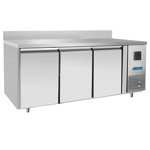 FULL OPTIONAL TOP AISI 304 – Tavolo refrigerato professionale di ultima generazione a basso consumo energetico e compatto ambientale. Tropicalizzato lavora fino a temperature di 43°C ambiente e 85% di umidità. Dotato di compressore “Embraco” e termostato digitale “Carel/Dixell”. Sbrinamento automatico con gruppo ventola “EBM”. Le porte autochiudenti con bloccaggio verso l’esterno hanno guarnizioni a incastro facili da smontare. L’interno ha angoli arrotondati per facilitarne la pulizia. In dotazione due griglie GN1/1 per porta con relative guide e ripiani di collegamento intermedi per creare un’unica superficie di appoggio interna. Disponibili varie configurazioni con cassetti GN1/1 al posto delle porte (vedi accessori).