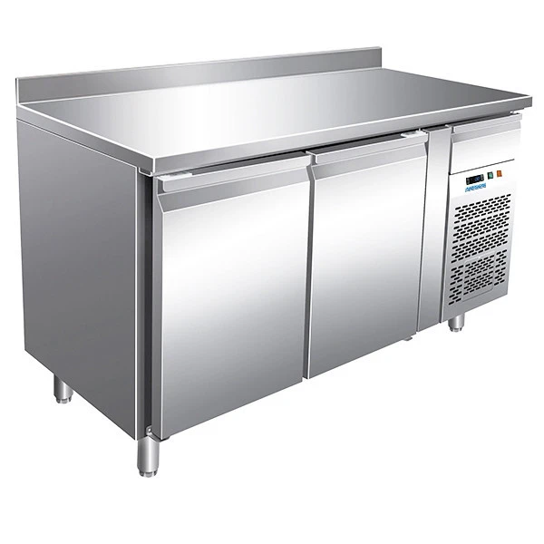 Tavolo refrigerato professionale per teglie GN1/1 prodotto in acciaio inox con refrigerazione ventilata. Gruppo incorporato estraibile per agevolare la manutenzione. Andamento circolare dell’aria fredda in modo da non toccare mai direttamente il prodotto. Termostato digitale per il controllo della temperatura e dello sbrinamento. Resistenza elettrica inserita nella cornice della porta per l’eliminazione della condensa. Di serie sbrinamento automatico ed evaporatore automatico dell’acqua di condensa trattato anti corrosione. La porta è dotata di molla di ritorno e guarnizioni estraibili che, insieme agli angoli interni arrotondati, garantiscono una facile pulizia. Possibilità di appoggio al muro. In dotazione 1 griglia GN1/1 per porta con una coppia di guide. Quattro piedi regolabili in acciaio inox.