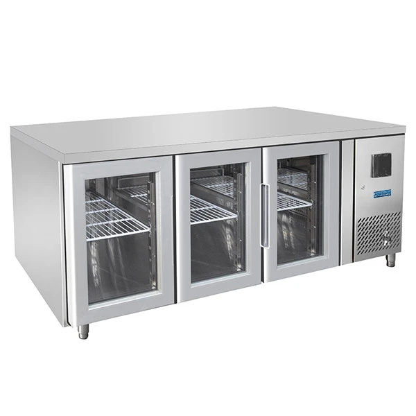 Tavolo refrigerato professionale con ante vetro per teglie GN1/1 realizzato in acciaio inox con un design pulito, E dotato di refrigerazione ventilata con sbrinamento ad aria. Gruppo incorporato tropicalizzato lavora fino a 40° C ambiente con umidità relativa, il termostato digitale permette un facile controllo di temperatura e sbrinamento. Nella cornice della porta è inserita una resistenza elettrica per eliminare una condensa. Evacuazione automatica dell’acqua di condensa. Lo spessore di isolamento camera è di 60 mm. Le guarnizioni sono magnetiche e facilmente estraibili, la camera con angoli interni arrotondati consente una facile pulizia. In dotazione di serie chiusura con vano tecnico con chiave e illuminazione a LED, N 1 griglia in dotazione GN/1 ed una coppia di guide per porta.