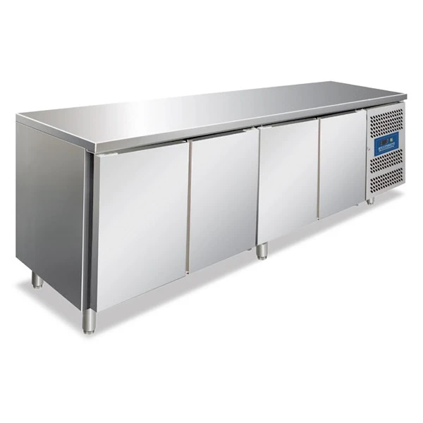 FULL OPTIONAL – Tavolo refrigerato professionale per teglie GN 1/1 di ultima generazione basso consumo energetico e compatto ambientale con struttura realizzata in acciaio inox. Tropicalizzato, lavora fino a temperature di 40°C ambiente e 60% di umidità. E’ dotato di refrigerazione ventilata e ricircolo di aria fredda con evaporatore trattato anticorrosione. Gruppo incorporato, termostato digitale che permette un facile controllo di temperatura e sbrinamento automatico con resistenza elettrica. Lo spessore di isolamento è di 6 cm, con chiusura ammortizzata delle ante, vano tecnico apribile ispezionabile con chiusura a chiave. In dotazione 8 ripiani interni in acciaio rivestito rilsan, n°4 con paio di guide regolabili, piedini regolabili in acciaio inox da 11 a 17 cm.