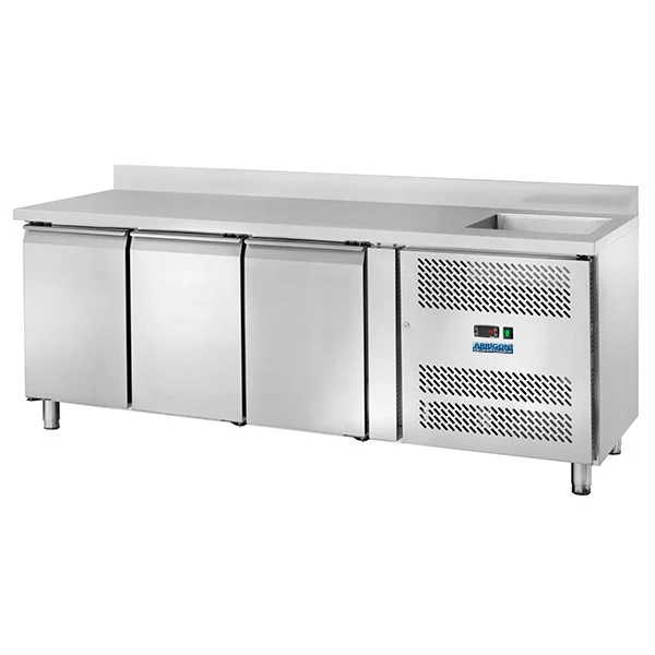 Tavolo refrigerato professionale per teglie GN1/1 con struttura realizzata in acciaio inox. Tropicalizzato lavora fino a temperature di 40°C ambiente e 60% di umidità. E’ dotato di refrigerazione ventilata e ricircolo aria fredda con evaporatore ad alette trattato anti corrosione. Gruppo incorporato. Il termostato digitale permette un facile controllo di temperatura e sbrinamento. Nella cornice della porta è inserita una resistenza elettrica per eliminare la condensa. Evaporazione automatica dell’acqua di condensa. Lo spessore di isolamento è di 6 cm. Le guarnizioni magnetiche facilmente estraibili e gli angoli interni arrotondati consentono una facile pulizia. In dotazione di serie chiusura del vano tecnico con chiave, piedi regolabili in acciaio inox. Dimensioni vasca cm. 40×40 h20. Alzatina posteriore di cm 10 in acciaio inox. N° 1 griglia GN1/1 ed una coppia di guide per porta.