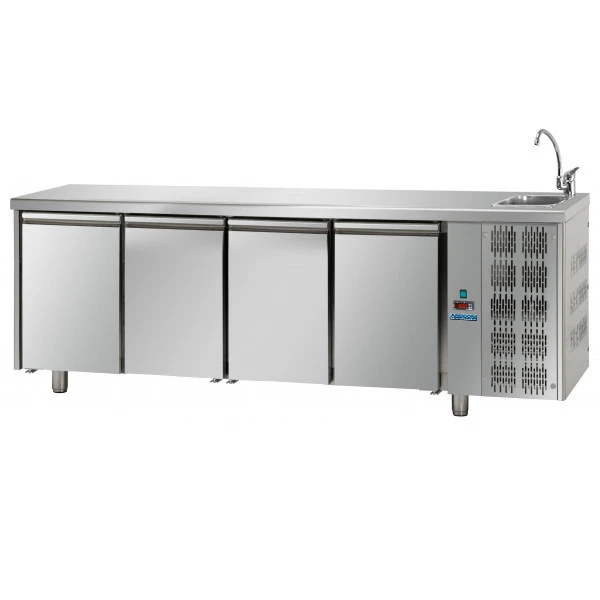 PRODOTTO TOTALMENTE ITALIANO – Costruito Internamente ed esternamente in Acciaio Inox e fondo esterno in acciaio galvanizzato. Con angoli interni arrotondati. Isolamento in poliuretano senza CFC iniettato ad alta pressione. Spessore di isolamento mm 50, ante con chiusura automatica e guarnizione magnetica. Pannello di controllo elettronico frontale con sonda NTC. Unità refrigerante a monoblocco estraibile e tropicalizzata di serie (temperatura ambiente +43°C HR 65%) gas utilizzato R452A/R455A. Refrigerazione ventilata. Su richiesta realizzabili anche predisposti per motore remoto. Sistema automatico di sbrinamento ed evaporazione dell’acqua di condensa. Piedini in acciaio inox regolabili. In dotazione una griglia GN1/1 e una coppia di guide per ogni anta. Vasca incassata da 23,5×33 h 18 cm fornita SENZA miscelatore.