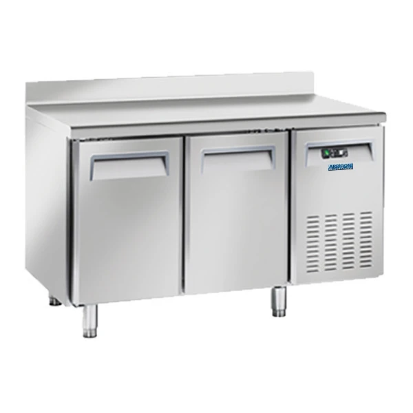 Tavolo refrigerato professionale profondità 60cm prodotto in acciaio inox con refrigerazione ventilata. Sbrinamento automatico con resistenza elettrica. La schiumatura realizzata in Ciclopentano presenta uno spessore di 6 cm. Termostato digitale per il controllo della temperatura e dello sbrinamento. Le porte autochiudenti sono dotate di guarnizioni estraibili che, insieme agli angoli interni arrotondati, garantiscono una facile pulizia. Possibilità di appoggio al muro. In dotazione 2 griglie cm 32,5×41 per porta complete di coppie di guide. Quattro piedi regolabili in acciaio inox. Alzatina posteriore di 10 cm.