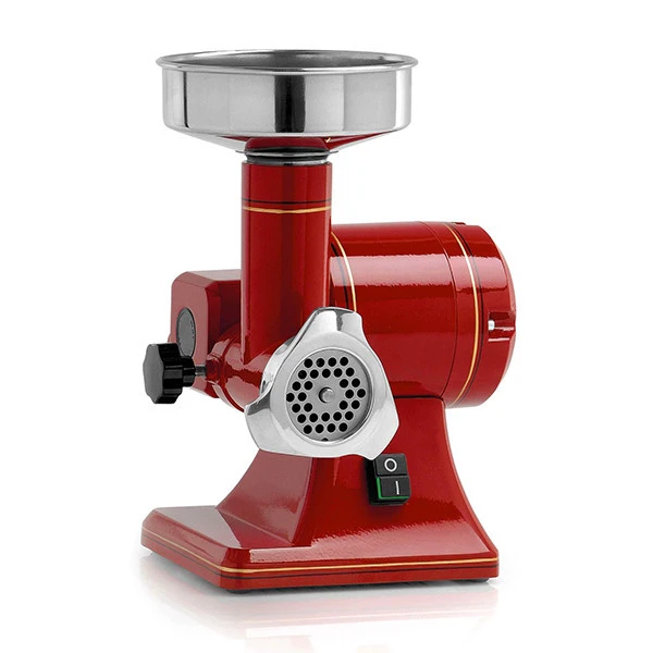 PRODOTTO TOTALMENTE ITALIANO – Tritacarne professionale costruito in lega di alluminio pressofuso e lucidato. Fascia in acciaio inox AISI 304 sul corpo motore. Motore asincrono ventilato con termica di protezione e ingranaggi elicoidali in acciaio temperato a bagno d’olio. E’ dotato di gruppo di macinazione carne asportabile completo di trafile auto affilanti in acciaio inox di serie. Viene fornito con tramogge e piatto raccolta prodotto in acciaio inox e pestello in ABS. Comandi a 24 volt come da normativa vigente.