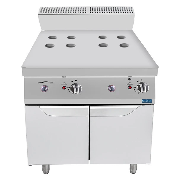 Vaporiera per ravioli professionale costruito con piano in acciaio inox AISI 304 spessore 1,5 mm a 8 geyser e doppia vasca realizzata in acciaio inox AISI 316 anticorrosione da 24+24 Lt di capacità. Il carico dell’acqua avviene tramite rubinetto frontale posto sul pannello comandi. Il riscaldamento avviene mediante bruciatore inox posto sotto la vasca equipaggiato con rubinetto di sicurezza con termocoppia, bruciatore pilota e accensione automatica piezoelettrica. In dotazione standard mobile chiuso con doppia anta a battente.