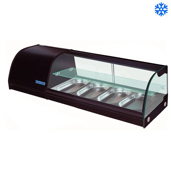 Vetrina da appoggio con refrigerazione statica con struttura in plastica nero e vetro frontale curvo. Invaso interno refrigerato per contatto costruito in acciaio inox con angoli arrotondati. Dotata di illuminazione a LED e gruppo di refrigerazione incorporato con sbrinamento manuale e condensazione automatica. Porte posteriori scorrevoli e piano intermedio in vetro e di facile estrazione per il caricamento dei prodotti. Termostato digitale regolabile di serie. In dotazione bacinelle GN 1/3.