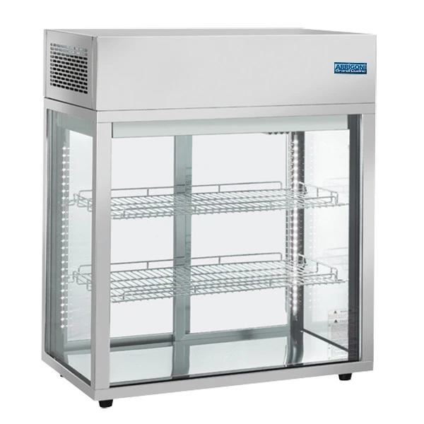 Vetrina refrigerata da banco con vetro dritto e struttura in acciaio, equipaggiata con luci LED, doppio vetro anti condensa, sportelli posteriori scorrevoli e ripiani regolabili cromati. Il modello è stato progettato per l’esposizione di qualsiasi alimento meriti la giusta visibilità sul tuo bancone.