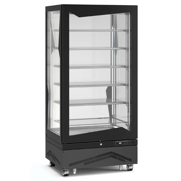 Vetrina ideale per esaltare i prodotti di gelateria con telaio in alluminio anodizzato nero o bianco. Temperatura regolabile tra +5°C e -20°C. Completa di porta con vetrocamera a bassa emissività e vetri temperati e serigrafati. Internamente è costruita in acciaio inox AISI 304 anticorrosione con finitura lucida a specchio. Refrigerazione ventilata con sbrinamento automatico a gas caldo. Panello comandi touch screen con retroilluminazione ad alto contrasto che permette di controllare termometro, illuminazione e modalità ECO. La porta è dotata di maniglia a scomparsa a tutta altezza. In dotazione di serie illuminazione a LED e serratura con chiave. Facile posizionamento grazie a 4 ruote piroettanti di cui due con freno e due piedini. 5 ripiani da 74,5×42,5 cm forniti di serie.