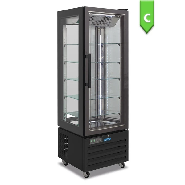 Vetrina ideale per esaltare i prodotti di pasticceria e gelateria con telaio in acciaio e in vetro nero o acciaio. Temperatura regolabile tra 0°C e +10°C. E’ dotato di sbrinamento automatico con resistenza elettrica, con un termostato elettronico e con la possibilità di aggiunta dello smart link wifi come optional. In dotazione di serie 4 Led verticali e serratura con chiave. Facile posizionamento grazie a 4 ruote piroettanti. 5 ripiani da 53×41,7 cm forniti di serie in vetro temperato.