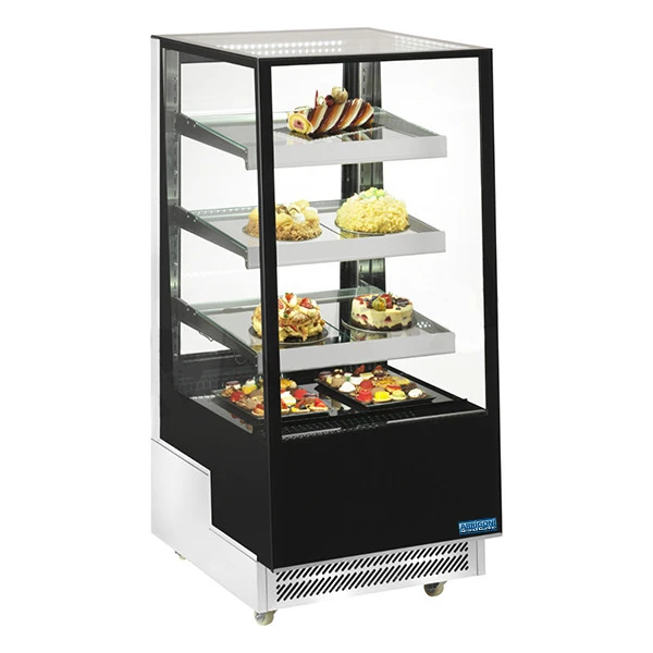 Vetrina espositiva ideale per esaltare i prodotti di pasticceria/gastronomia con refrigerazione ventilata che favorisce una massima uniformità di temperatura, regolabile da 2+ a +8° C in tutti punti della camera, dotata di 3 ripiani espositivi in vetro regolabili, 4 fronti espositivi che assicurano un ottima visibilità dei prodotti, ante scorrevoli lato operatore. Dotata di 4 ruote piroettanti (di cui 2 con freno)