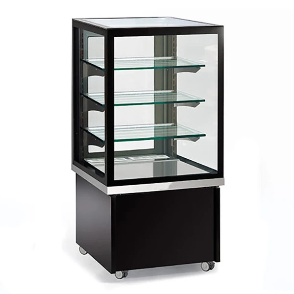 Vetrina ideale per esaltare i prodotti di pasticceria con telaio in lamiera di acciaio zincato e pannelli del basamento in legno multistrato nero. Ripiano di fondo in acciaio inox traforato di facile pulizia. Temperatura regolabile tra +3°C e +10°C. Doppia vetrocamera con isolamento ad aria secca e vetro superiore panoramico. Pannello comandi elettronico con retroilluminazione ad alto contrasto che permette di controllare termometro, illuminazione e modalità ECO. In dotazione di serie illuminazione a LED per ogni ripiano e 3 ripiani regolabili da 39,5×56,5 cm.