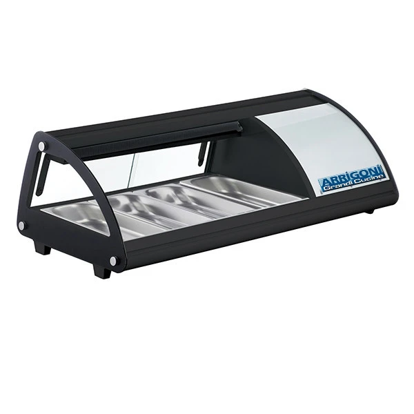Vetrina espositiva refrigerata per Sushi che consente una perfetta esposizione mantenendo una temperatura ottimale per il prodotto. E’ dotata di luce LED interna e struttura in plastica e vetro. Refrigerazione statica sottopiano per contatto ed evaporatore superiore che raffredda per caduta. Sbrinamento automatico e termostato digitale. I vetri posteriori apribili a scorrimento. Adatta a contenere bacinelle GN1/3 h4 incluse.