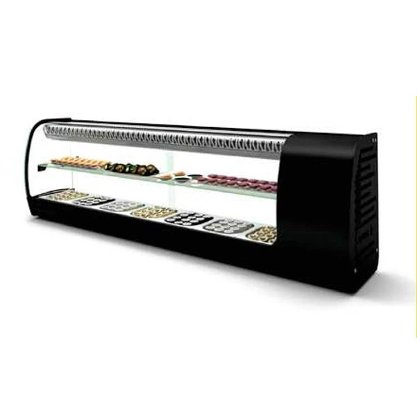 Vetrina da appoggio slim con REFRIGERAZIONE STATICA, permette ampia visibilità e grande superficie di appoggio. Invaso interno refrigerato per contatto, in Acciaio Inox con angoli arrotondati.